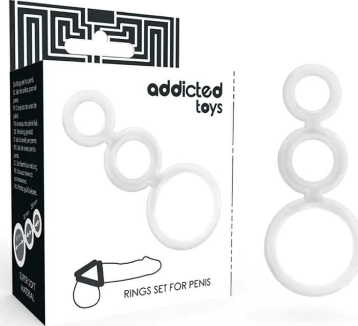 Krijg de ondersteuning die je nodig hebt met de ADDICTED TOYS set van penisringen. Deze ringen stimuleren niet alleen de erectie maar helpen ook om voortijdige ejaculatie te voorkomen. Het ontwerp voorkomt dat ze verschuiven, wat zorgt voor een comfortabele ervaring. De set bestaat uit 3 ringen in verschillende maten: 50 mm, 32 mm en 28 mm in diameter.