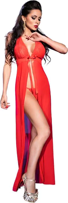 Deze lange babydoll biedt een elegante uitstraling met een sexy opening, vervaardigd uit een licht en elastisch materiaal dat zacht aanvoelt op de huid. Het is niet alleen een kledingstuk, maar een uiting van stijl en sensualiteit. Inclusief een bijpassende tanga, dit is de geeignete keuze voor wie een vleugje glamour aan haar nachtlook wil toevoegen.