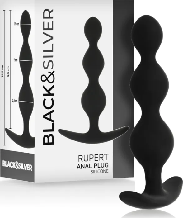 Dit is een set anale ballen (Black&Silver Rupert) met vijf achter elkaar geplaatste elementen in zachte, flexibele siliconen. Ik zou 'm aanraden aan klanten die starten met anale stimulatie of willen trainen: de kralen lopen geleidelijk in omvang en de flexibele structuur volgt de contouren van je lichaam, wat het inbrengen comfortabeler maakt. De vaste basis zorgt dat je het seksspeeltje altijd veilig terug kunt trekken.