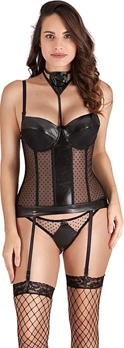 Complete 4-delige bustierset van S Pleasures: bustier met jarretels, bijpassende tanga, afneembare halsaccessoire en visnetkousen. Perfect als je een sexy, semitransparante look wilt met verstelbare details. Kies deze set als je houdt van speelse stippen en een stretchy fit; kies iets anders als je stevige shape-wear of maatgerichte pasvormen nodig hebt.