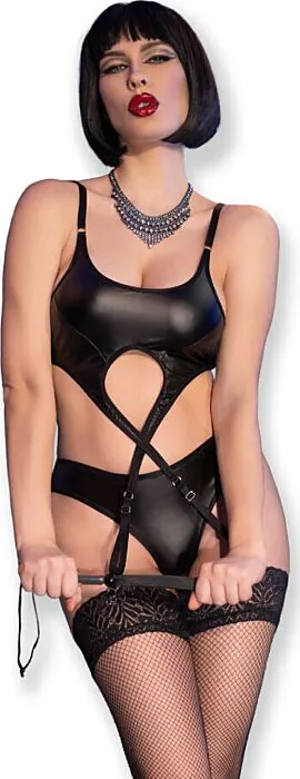 | Onderdelen | Top met verstelbare jarretelbandjes, open tanga, kousen, silicone zweep |