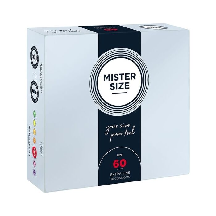 ¡MISTER SIZE 60 (PAKKET VAN 36) - VOOR DEGENEN DIE VAN GROOT EN STRAK HOUDEN! Last van afzakkende, knellende of gewoonweg niet passende condooms? Vergeet die problemen met Mister Size 60! Want wat is het belangrijkste aan een condoom? Dat het past als een handschoen! Waarom kiezen voor Mister Size 60? - **Op maat gemaakt:** Je zou toch ook geen ondergoed twee maten te klein dragen, toch? Jouw condooms verdienen ook een op maat gemaakte pasvorm. Met Mister Size 60 voelt het alsof het speciaal voor jou is ontworpen. - **Meer plezier:** Het extra dunne ontwerp zorgt voor een unieke gevoeligheid. Je zult alles voelen en nergens bang voor zijn! - **Veiligheid voorop:** Met Mister Size 60 hoef je je geen zorgen te maken over ongemakkelijk afglijden of onverwachte breuken. - **Verscheidenheid aan maten:** Met 7 verschillende maten past Mister Size bij iedereen. Want iedereen verdient het om te genieten van het comfort en de bescherming die een op maat gemaakt condoom biedt! Waarom is de maat belangrijk? In een wereld waar maat er wel toe doet, springt Mister Size 60 eruit met zijn 60 mm breedte. Ideaal voor degenen die op zoek zijn naar een ruimere en comfortabelere pasvorm. Neem geen genoegen met minder en kies voor Mister Size voor een superieure ervaring! Laat een slecht passend condoom het moment niet verpesten! Met Mister Size 60 geniet je van comfort, veiligheid en sensatie bij elke ontmoeting. Schaf je pakket van 36 extra dunne condooms aan en begin te genieten zoals nooit tevoren!