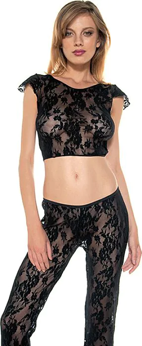 Een sierlijk setje van legging en bijpassende top in zwart kant van Music Legs. Geschikt voor wie een vrouwelijk, zichtbaar kanten look zoekt zonder gedoe met losse onderdelen. Draag het als lingerie voor een speciale avond of combineer met je outfit voor een gewaagde touch. Voor wie wil opvallen zonder ingewikkelde sluitingen.