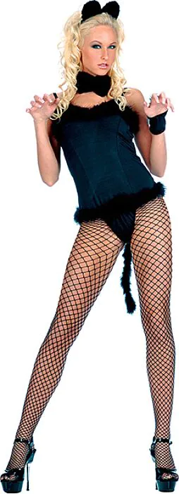 Werk het af met zwarte kousen, hoge hakken en eventueel een halsband of armbanden in hetzelfde kleurpalet. Een opvallende make-up en staaltjes (los bij te bestellen) maken de outfit compleet voor thema-avonden of fotosessies.
