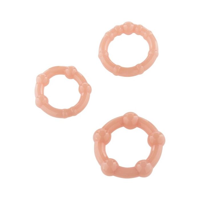 Geef je penis de kracht die het verdient met Stay Hard - Set van Drie Penisringen in Vleeskleur! Dit revolutionaire kit biedt je niet slechts één, niet twee, maar drie siliconen ringen van verschillende maten om je intieme ervaring naar een hoger niveau te tillen!