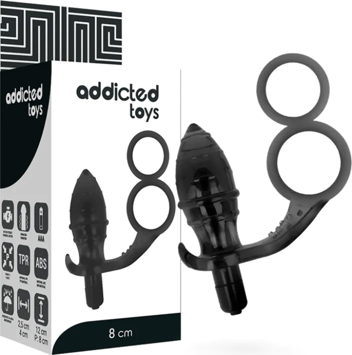 Intense stimulatie en druk met deze anal plug van ADDICTED TOYS. De combinatie van een plug en dubbele ring zorgt voor een unieke ervaring die je zintuigen prikkelt. Gemaakt van zacht TPR, dit speeltje past zich snel aan jouw lichaamstemperatuur aan en de gebogen punt zorgt voor gerichte stimulatie. Met een motor voor extra vibratie, krijg je een dimensie van genot die je niet wilt missen.