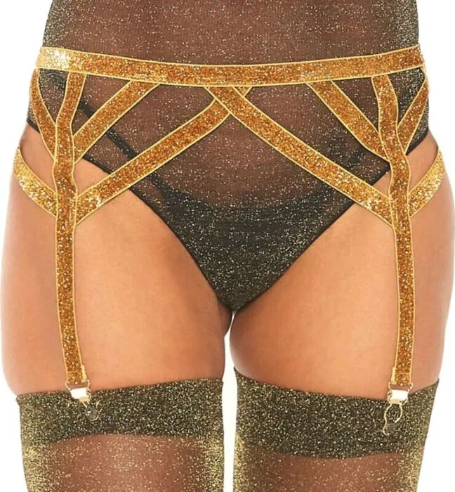 Voeg een vleugje luxe toe aan je lingeriecollectie met dit gouden lurex liguero van Leg Avenue. Geschikt voor iedereen die zijn vrouwelijkheid wil benadrukken.