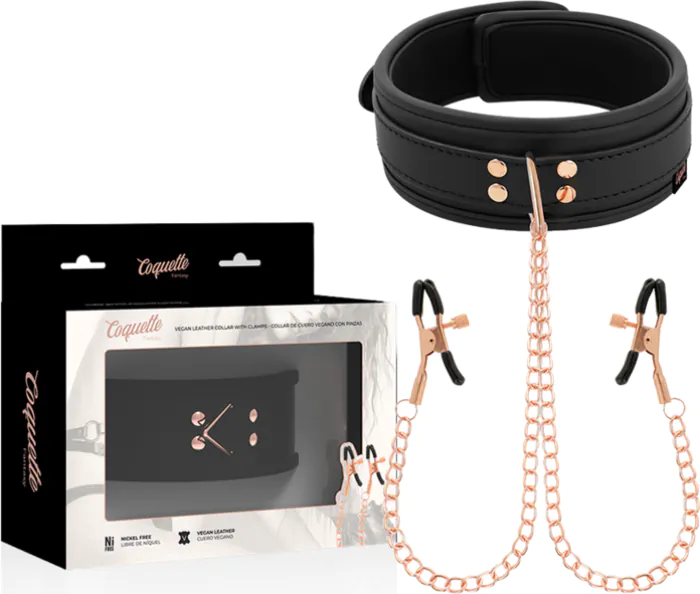 Beleef directe stimulatie met het Coquette Fantasy collar en de stevige pinzas voor tepels. Gemaakt van duurzaam vegan leer, biedt dit kettingset de perfecte balans tussen comfort en spanning. De pinzas zijn eenvoudig aan te passen, zodat je zelf de gewenste druk kunt bepalen. Of je nu net begint met fetisjspel of al meer ervaring hebt, dit collar sluit aan bij jouw wensen.