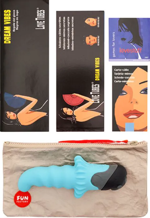 ¿El plan de todas las noches con tu pareja es mirar la televisión hasta las tantas? Descubre lo bueno que es disfrutar del placer entre vosotros y atrévete a jugar con Dream Vibes, en él encontraras un vibrador fantástico, Stubby sumergible de Fun Factory, además de diferentes pruebas y misiones secretas para superar tanto para él como para ella. Este juego os aportará a ti y a tu pareja un placer erótico puro, además de tener la oportunidad de conoceros mutuamente en esta nueva faceta tan sensual. ¿Quién ha dicho que jugar es cosa de niños? Además del divertido vibrador y el cuaderno con 14 misiones secretas, el juego incluye un gel lubricante y 4 tarjetas-mimos. ¿Preparados para resolver la misión secreta?El juego incluye: un vibrador Stubby sumergible de Fun Factory, una bolsita para guardar el vibrador, también de fun factory, un cuaderno con 14 misiones, 4 tarjetas-mimos, un cuaderno con las reglas del juego, gel lubricante. Idiomas: francés, español, Italiano y portugués