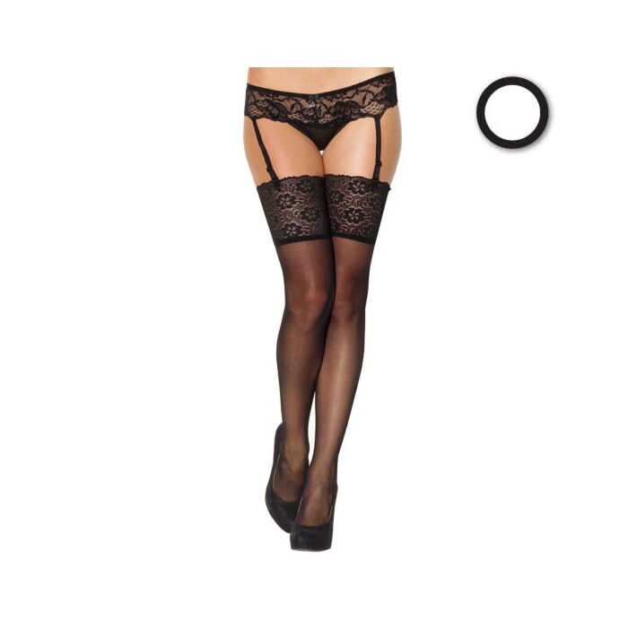 Fantásticas medias de color blanco de 15 deniers con encaje en la parte superior que viene encolada por la parte interior con silicona, lo que las hace autoadherentes a tu piel, de la prestigiosa colección Kiss Me.