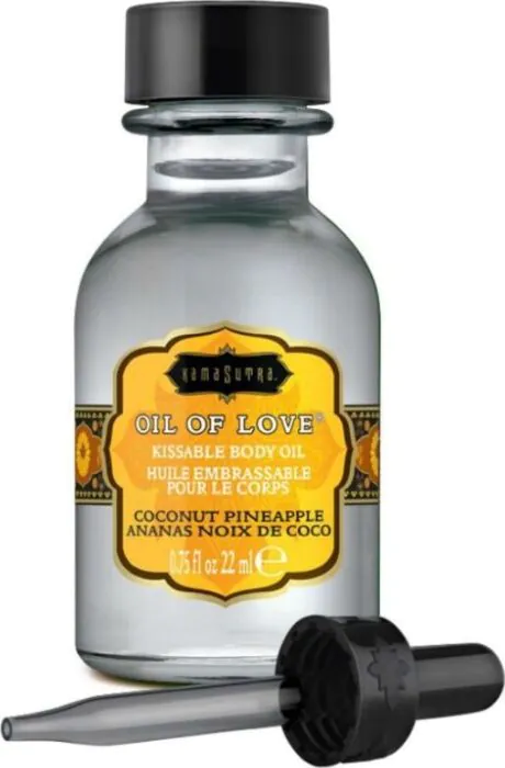 Dit is een eetbare "kissable" olie van KAMASUTRA met duidelijke kokos- en ananassmaak. Je gebruikt 'm tijdens het voorspel om lippen en erogene zones te besprenkelen en met blazen een lichte warmte op de huid op te roepen — daarna kus je de plek en proef je de smaak. Belangrijk: het is geen massageolie en geen glijmiddel, het is gemaakt voor kussen en likken.