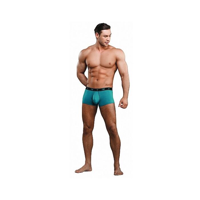 Bóxer elástico fabricado con fibras de bambú en color azul. Dispone de una costura que realzará tus genitales haciéndolos parecer más voluminosos. La cintura es ancha y elástica para acomodarse a tu cuerpo.