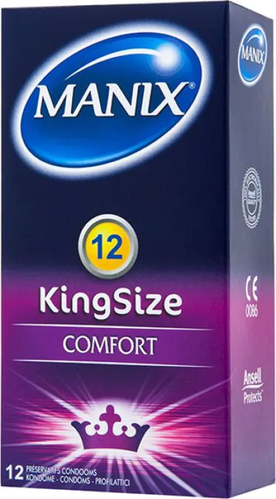 Manix King Size is een set van 12 condooms met een bredere pasvorm (56 mm) voor wie meer ruimte nodig heeft zonder in te leveren op veiligheid. Transparant, licht geparfumeerd met vanille en al voorzien van glijmiddel. Geschikt als je standaardcondooms te krap voelen; niet geschikt bij latexallergie.