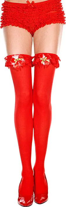Speelse opaque kousen van Music Legs met een decoratieve strik en klein belletje op de jarretel — bedoeld als feestelijk accessoire voor speciale gelegenheden. Geschikt voor wie een opvallende, maar eenvoudige toevoeging aan een kerst- of feestoutfit zoekt. Niet bedoeld als shapewear of medische compressiekousen.