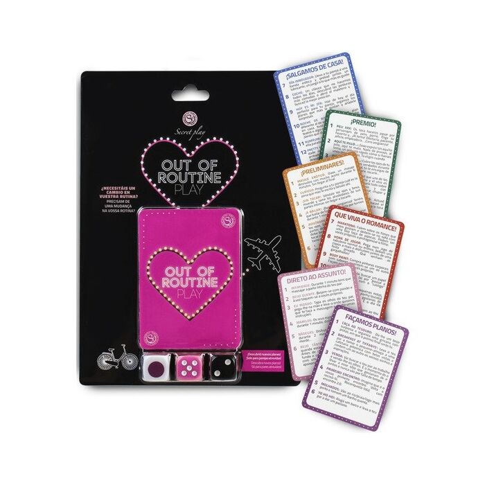 ¡Geef een opwindende draai aan je intieme leven met het spannende spel "Out of routine play" van Secret Play! Voed de passie en doorbreek de monotonie samen met je partner. Ben je klaar om nieuwe ervaringen te ontdekken en te genieten van spannende uitdagingen? Gooi de dobbelstenen en dompel jezelf onder in een wereld van plezier en passie!