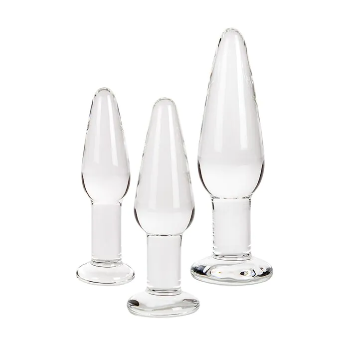 Een set van drie transparante glazen anal plugs in oplopende maten, bedoeld voor wie rustig wil opbouwen. Glas is stijver dan silicone, ideaal voor precieze plaatsing en temperatuurspelen. De vlakke basis geeft goed houvast bij in- en uitbrengen. Geschikt voor beginners die stap voor stap willen wennen aan anale penetratie.