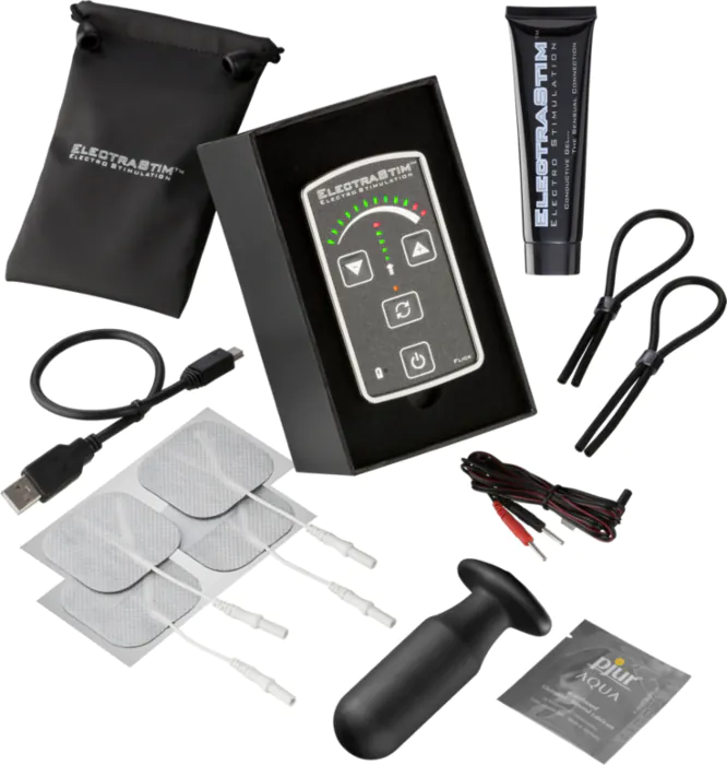 Voor wie elektrosex wil proberen met één compleet pakket: bewegingsbediening, pads, siliconen elektrode en peniskringen.