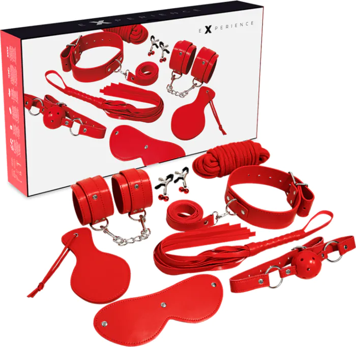 Ontdek de spannende wereld van BDSM met dit complete set van EXPERIENCE. Geschikt voor zowel beginners als ervaren spelers. Geniet van de veelzijdige accessoires van kunstleder in een gedurfde rode kleur.