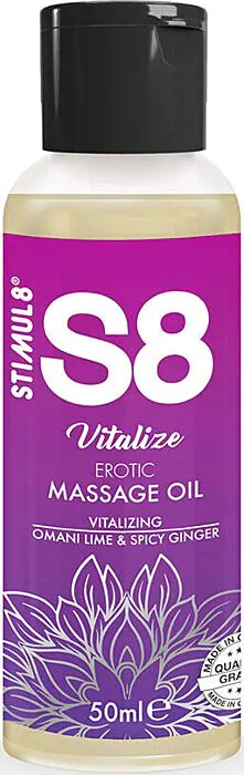 S8 Vitalize van STIMUL8 is een voedende erotische massageolie (50 ml) met een frisse limoen- en gembergeur. De mix van jojoba, amandel en sesam voedt en verzorgt de huid zonder parabenen of gluten, en is aantrekkelijk geprijsd voor wie een kwalitatieve, plantaardige olie zoekt. Niet geschikt bij latex-condooms of silicone seksspeeltjes.