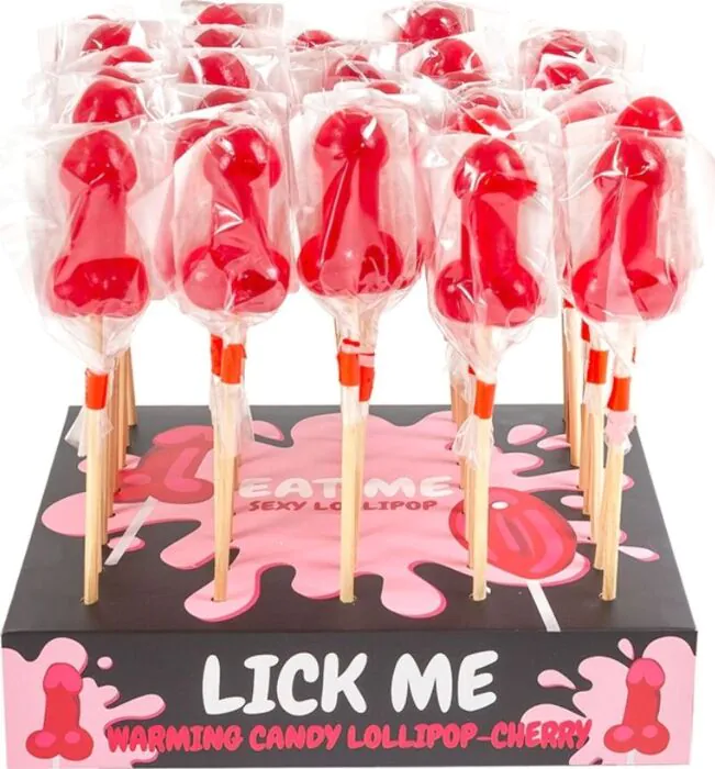 Als ik 'm in de winkel aan je zou laten zien: dit is een 100% eetbare snoeplolly in penisvorm met kersensmaak en een pittig verwarmend effect. Het is geen seksspeeltje dat vibraties geeft, maar een ludiek, smakelijk accessoire voor volwassenen die houden van speelse extras tijdens feestjes of private avonden. Het verwarmende element geeft een kleine 'kick' in de mond, niet een mechanische hitte.