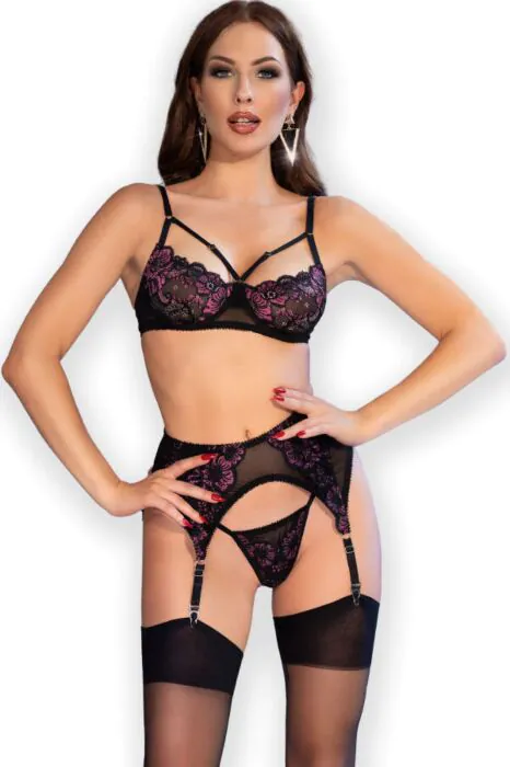 Het set bevat een verstelbare beha, een liggouder, een tanga en kousen, waardoor je een complete look hebt voor elke gelegenheid.
