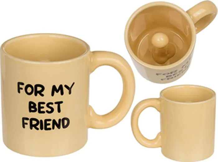 Een keramische mok die op het eerste gezicht gewoon lijkt, maar in de bodem een penis verbergt en de tekst "For my best friend" draagt. Geschikt als ludiek cadeau voor vrienden met humor. Degelijke, glanzende afwerking in vanillekleur maakt het een opvallend presentje zonder poespas.