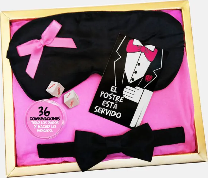 Met het INEDIT Kit El Postre Está Servido breng je een speelse sfeer in de slaapkamer. Inclusief een antifaz, twee dobbelstenen met 36 combinaties, en een pajarita voor hem. Practico voor koppels die hun intimiteit willen verkennen.