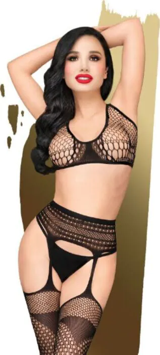 Dit Smoking Gun Set van Penthouse is een verleidelijke combinatie van een korselet en kousen met een sexy haakjespatroon. Great voor wie zijn of haar sensualiteit wil benadrukken.